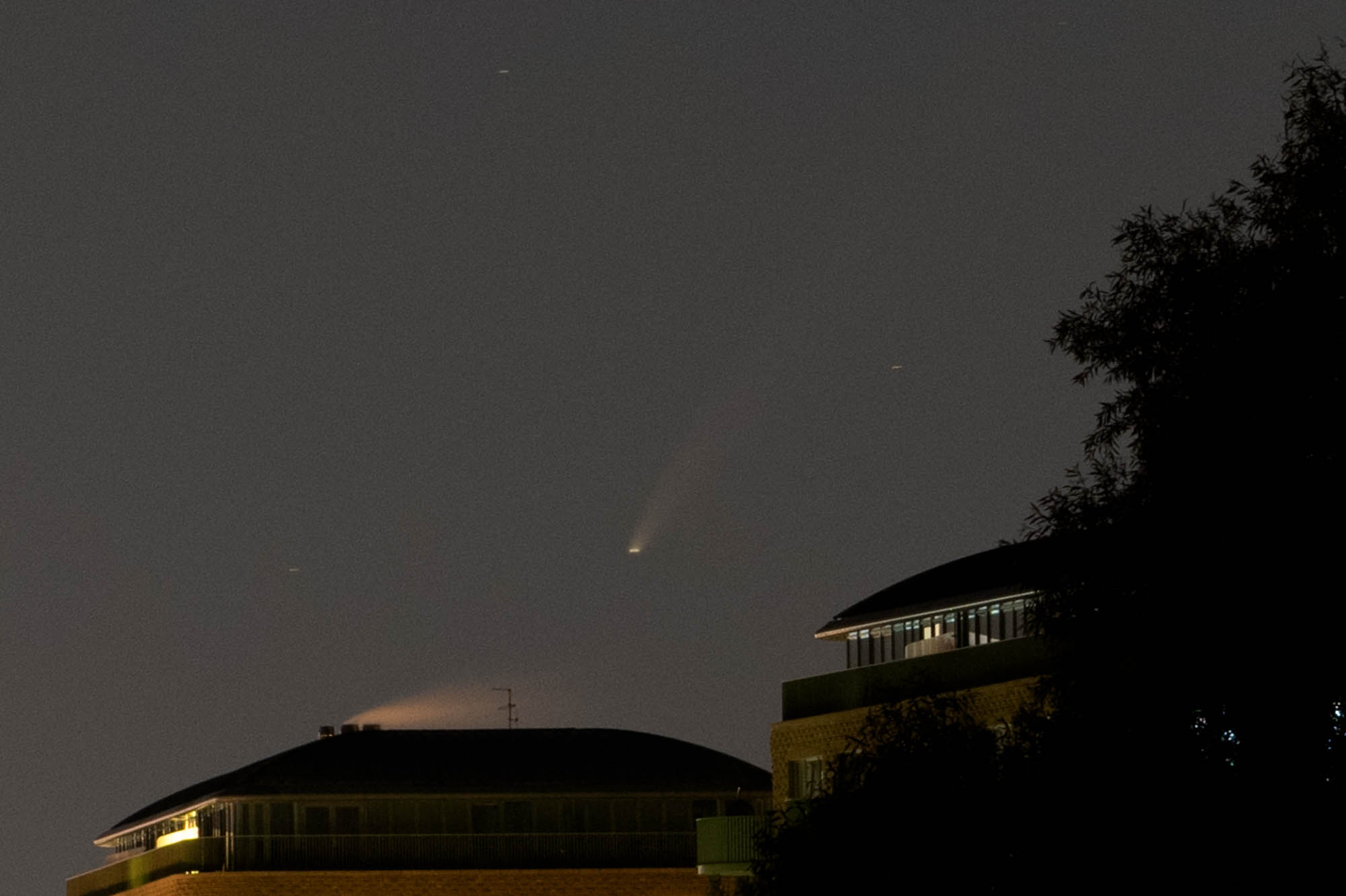 NEOWise is now circumpolar. Just after midnight - almost at the lowest place in its daily path. It looks better in binoculars - I just put the camera on the tripod.